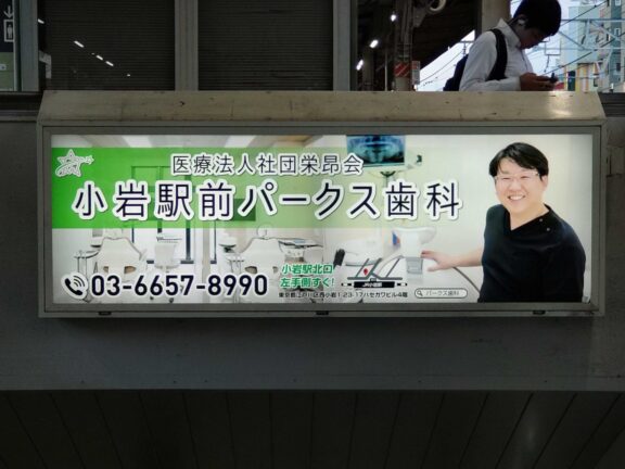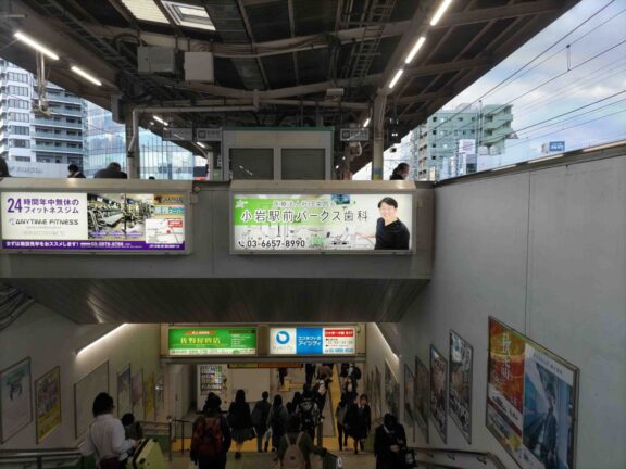 JR小岩駅のホームから改札に向かう階段に、当院の看板を設置しました。