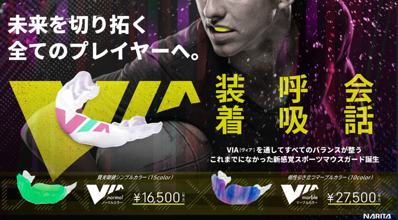 当院では、歯科技工所 成田デンタル社と提携し、完全オーダーメイドのスポーツ用マウスガード「VIA」をご提供しています。歯科医師と歯科技工士が一人ひとりの口腔構造を精密に分析し、呼吸・発話の妨げにならない違和感の少ない設計、高性能素材による優れたフィット感・耐久性を実現します。スポーツ時の歯や口腔、さらには脳への衝撃リスクにも配慮されており、安心してプレーに集中できるようにサポートいたします。従来より約30%薄く作られているため装着時のストレスを大きく軽減でき、市販の大量生産品とは一線を画す本格仕様となっています。野球・バスケットボール・格闘技、ロードバイクやサーフィンなどあらゆるスポーツシーンに対応しているので、もしご興味があるようでしたら、当院スタッフまでお気軽におたずねください。